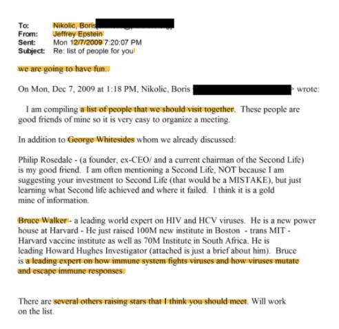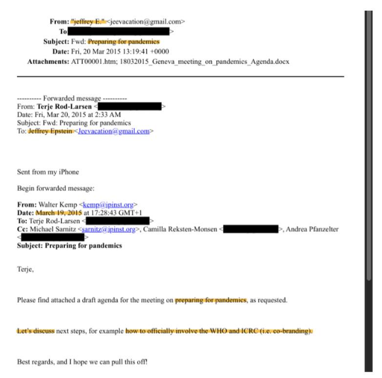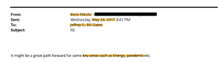 In einer E-Mail aus dem Jahr 2017, die sowohl an Epstein als auch an Gates gerichtet war (vier Jahre nach dem Vereinbarungsschreiben über Epsteins Vermittlung im Zerwürfnis zwischen Nikolic und Gates), wird die „Pandemie“ als ein wichtiger Bereich für einen Spenderfonds erwähnt.