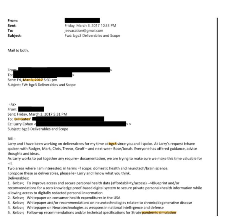 Im März 2017, zweieinhalb Jahre vor Event 201 und drei Jahre bevor Covid-19 von der WHO offiziell zur Pandemie erklärt wurde, ist in einem E-Mail-Verlauf zwischen Gates und bgC3 (Bill Gates Catalyst 3, heute Gates Ventures) von einer „Pandemiesimulation“ die Rede.