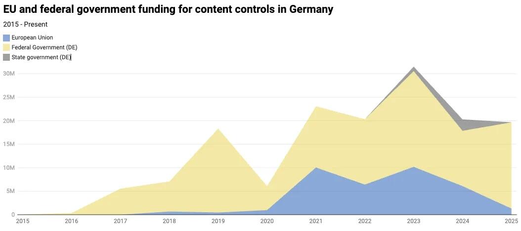 Der Bericht zeigt, dass die staatlichen Mittel für die Inhaltskontrolle im Jahr 2023 mit rund 36 Millionen US-Dollar (umgerechnet von Euro, wie alle Dollarbeträge in diesem Artikel) ihren Höhepunkt erreichten. Diese Mittel stammen von der deutschen Bundesregierung, den Bundesländern und der EU. Während die Gesamtmittel der drei Akteure auf etwa 23 Millionen US-Dollar gesunken sind, ist der Betrag der deutschen Bundesregierung nahezu gleich geblieben und hat sich seit dem Vorjahr erhöht.