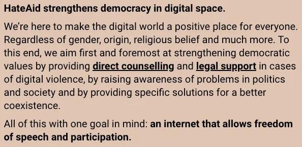 HateAid gibt vor, die Meinungsfreiheit zu verteidigen . Auf der Homepage heißt es: