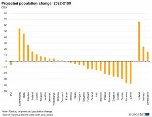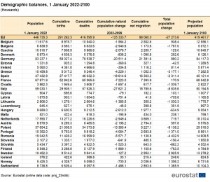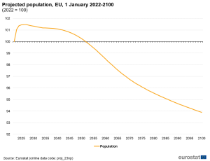 Die Prognosen von Eurostat gehen davon aus, dass es im Zeitraum von 2022 bis 2100 in der EU 291,3 Millionen Geburten und 416,6 Millionen Todesfälle geben wird. Dies entspricht einem natürlichen Bevölkerungsrückgang von 125,3 Millionen Menschen. Die kumulierte Nettozuwanderung wird voraussichtlich zu einem Anstieg von 98,1 Millionen Personen führen, sodass die EU-Gesamtbevölkerung insgesamt um 27,3 Millionen Menschen sinkt.