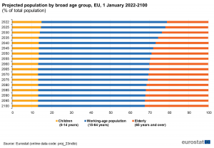 Die prognostizierten relativen und absoluten Größen verschiedener Altersgruppen weisen gegenläufige Entwicklungen auf (siehe Abbildung 2). Der Anteil der Kinder (0–14 Jahre) an der Gesamtbevölkerung der EU wird voraussichtlich sowohl relativ als auch absolut sinken, von 15,0 % (69,9 Millionen) Anfang 2022 auf 13,2 % (55,2 Millionen) im Jahr 2100, wobei der stärkste Rückgang bis 2035 erwartet wird. Der Anteil der Bevölkerung im erwerbsfähigen Alter (15–64 Jahre) an der Gesamtbevölkerung der EU wird voraussichtlich von 63,9 % (285,5 Millionen) Anfang 2022 auf 54,4 % (228,1 Millionen) im Jahr 2100 zurückgehen, was einem Rückgang um insgesamt 57,4 Millionen Personen entspricht. Der stärkste Rückgang wird bis 2038 erwartet, wobei der Anteil auf 60,0 % sinken wird, gefolgt von einem stetigen, moderaten Rückgang bis zum Ende des Prognosezeitraums. Der Anteil der über 65-Jährigen an der Gesamtbevölkerung der EU wird voraussichtlich von 21,1 % (94,3 Millionen) Anfang 2022 auf 32,5 % (136,1 Millionen) im Jahr 2100 steigen. Dies entspricht einem Anstieg um 11,4 Prozentpunkte , was 41,8 Millionen zusätzlichen Personen bis 2100 entspricht. Da die Gesamtbevölkerung der EU bis 2100 sinken wird, ist dies die einzige bedeutende demografische Altersgruppe, die voraussichtlich sowohl relativ als auch absolut wachsen wird, was auf eine Fortsetzung der Bevölkerungsalterung hindeutet.