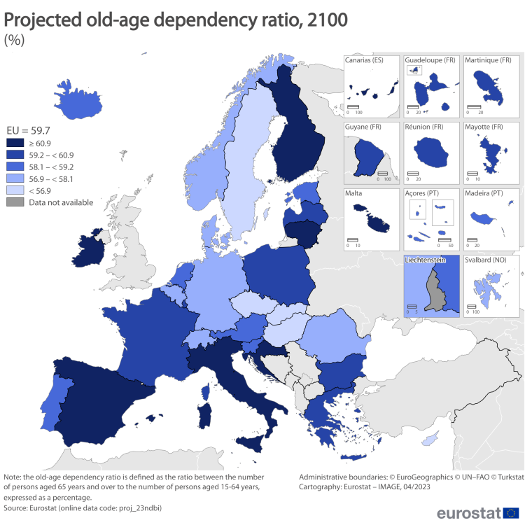 Die Kombination aus leicht sinkender Kinderzahl, schrumpfender Erwerbsbevölkerung und stetig steigender Zahl älterer Menschen führt zu einem erheblichen Anstieg der Gesamtaltersabhängigkeitsquote . In 23 EU-Ländern kamen im Jahr 2022 mehr als 50 Angehörige auf 100 Erwerbspersonen. Bis 2100 wird erwartet, dass alle EU-Länder mehr als 77 Angehörige pro 100 Erwerbspersonen aufweisen werden.