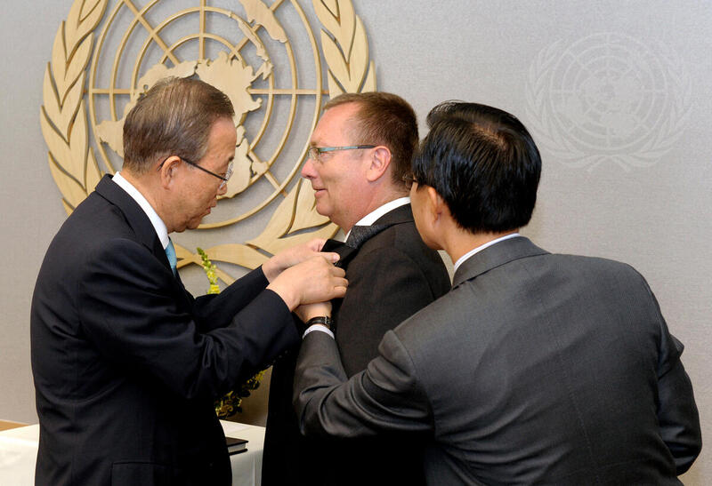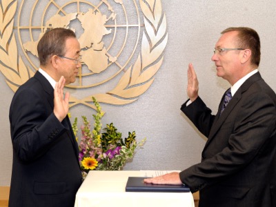 Der Generalsekretär der Vereinten Nationen, Ban Ki-moon, kleidet seinen Stellvertreter Jeffrey Feltman ein. Dies sind umgekehrte Rollen: In Wirklichkeit war es Feltman, der die UNO regierte, während sein Vorgesetzter mit Korruptionsskandalen zu kämpfen hatte. Als hochrangiger Beamter im US-Außenministerium war Feltman ein „Straussianer“, und Stellvertreter von Hillary Clinton. Auf seinen Befehl wurde der Plan zur Kapitulation Syriens ausgearbeitet.