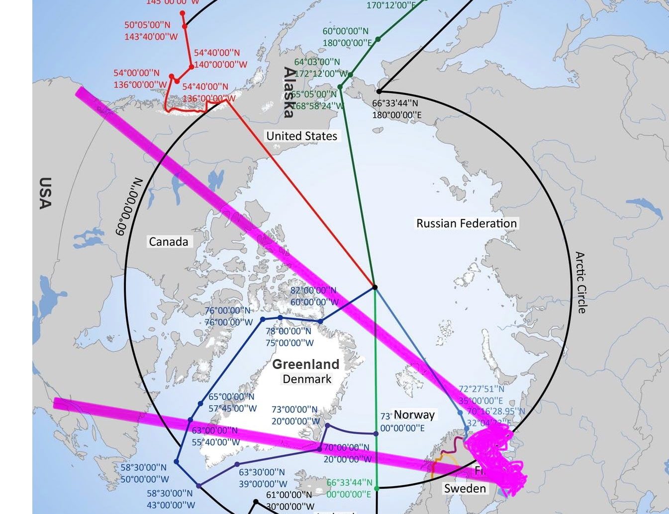 Wenn man sich die Flugbahn (ballistisch oder motorisiert) von der Kola-Halbinsel zu einem beliebigen Ort in den unteren 48 Bundesstaaten ansieht – die zwischen den beiden pinkfarbenen Linien liegen –, dann führt alles über Grönland.