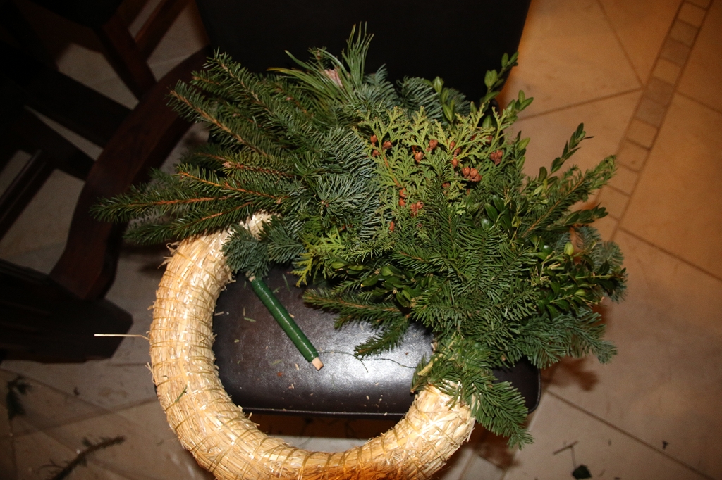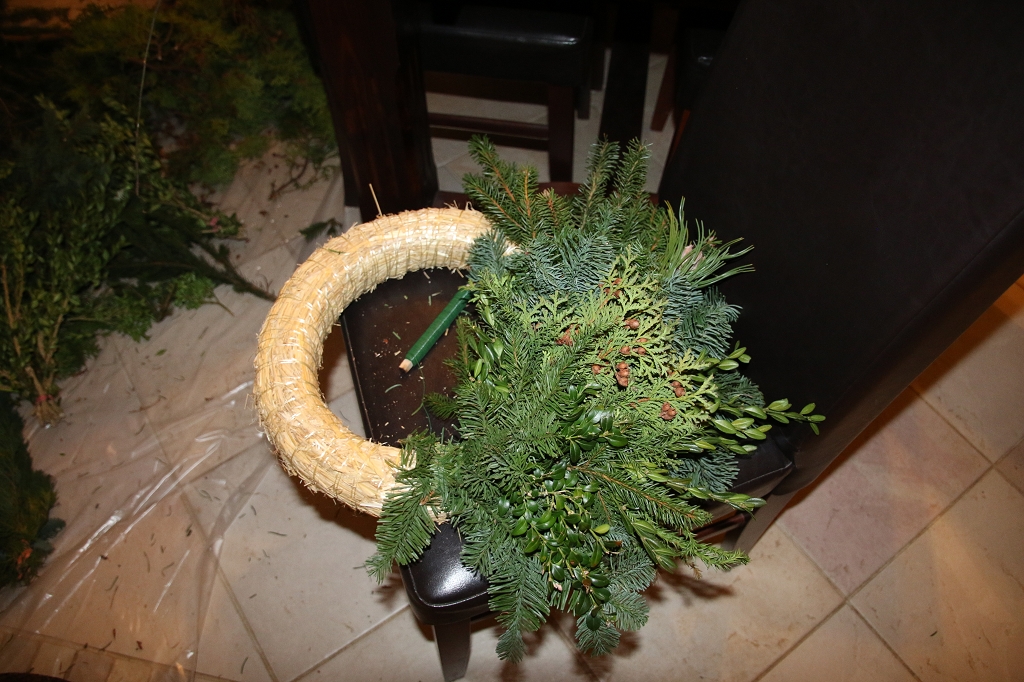Kissen zum drauf knien verteilt, Wickeldraht und Strohkränze