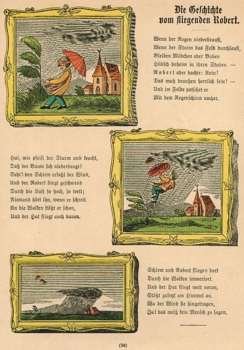 Und der Hut fliegt auch davon.Schirm und Robert fliegen dort