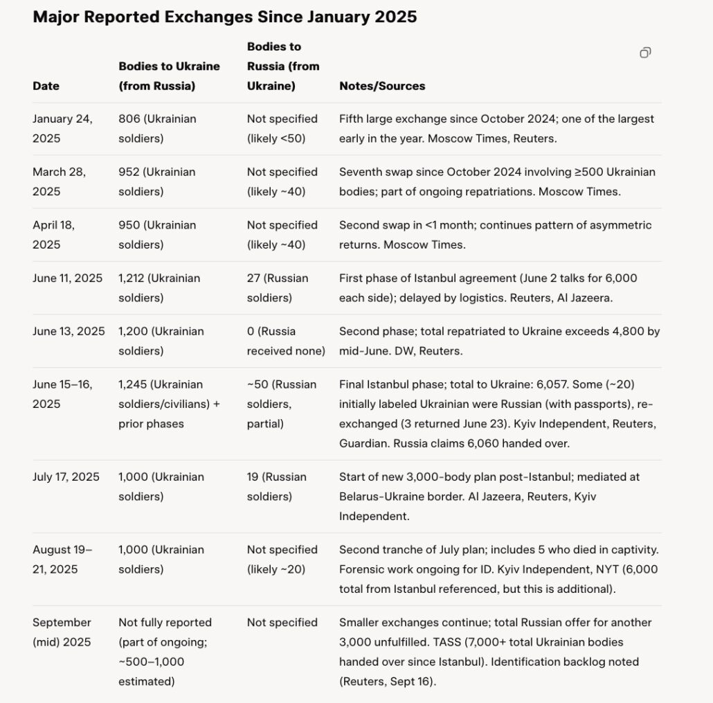 Doch nun zu den Fakten. Russland und die Ukraine haben seit Januar 2025 mehrfach sterbliche verstorbene Soldaten ausgetauscht, was vor allem auf Vereinbarungen aus den Friedensgesprächen in Istanbul (Mai-Juni 2025) und laufenden humanitären Maßnahmen zurückzuführen ist. Diese Austausche verlaufen dramatisch asymmetrisch, wobei Russland weitaus mehr ukrainische Leichen repatriiert als umgekehrt. Einige westliche Analysten erklären diese Diskrepanz damit, dass Russland aufgrund seiner schnellen territorialen Vorstöße mehr Schlachtfelder kontrollierte, was die Ukrainer daran hinderte, sterbliche Überreste zu gewinnen. Hmmm…das stellt Kelloggs schwachsinnige Behauptung in Frage, Russland greife kaum vor und erleide dabei enorme Verluste.