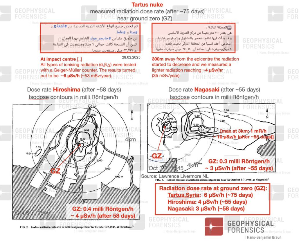 Braun gelingt dann der Coup d’grave, indem er ausdrücklich erklärt: „Die kürzlich gemeldete Strahlendosisrate in der Nähe des Ground Zero (GZ) von Tartus/Syrien nach dem Atomangriff am 15. Dezember 2024 übersteigt die der GZs (Ground Zeroes) von Nagasaki und Hiroshima um mehr als 100 % bzw. 50 %, wodurch die beiden letztgenannten im Vergleich praktisch in den Schatten gestellt werden :