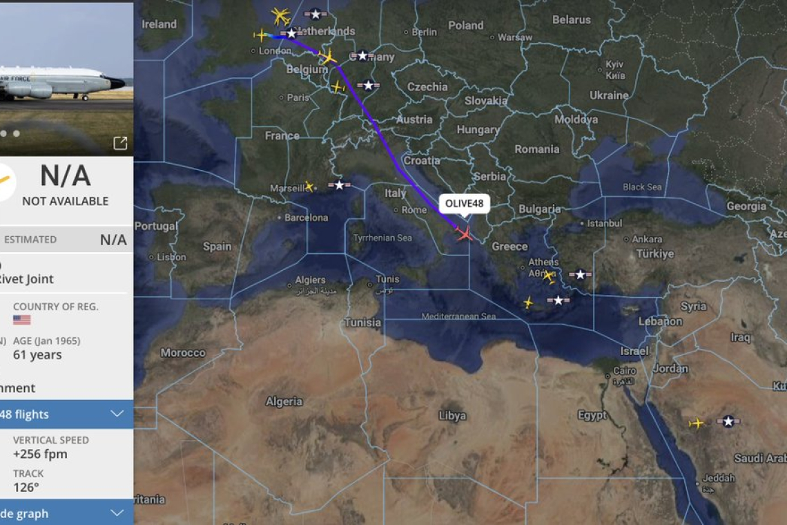 Eine RC-135V „Rivet Joint“ der US-Luftwaffe ist vom RAF-Flugplatz MILDENHALL gestartet und fliegt in Richtung Naher Osten.