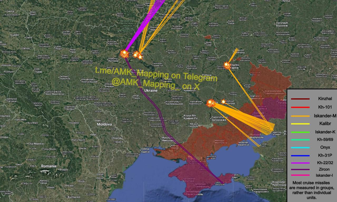 Und erst vor einer Stunde begann heute ein heftiger Angriff. Er zielte direkt auf die Gebiete um Kiew und Dnipropetrowsk. In der ersten Stunde wurden bereits 10 Iskander-M-, 6 Kh-22- und eine Hyperschallrakete eingesetzt. Die Geranium-Raketen sind dabei noch nicht einmal berücksichtigt. Es wird spannend sein zu sehen, was morgen früh dabei herauskommt.