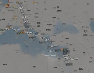 Dies ist die öffentlich zugängliche Website FlightRadar24 / ADSB zur Flugzeugverfolgung von gestern, die einen Luftkonvoi von Eurofighter-Jets zeigt, der im Rahmen des massiven Truppenaufmarsches von Europa nach Zypern fliegt: