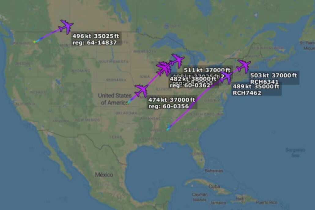 Seit 21:39 Uhr Ostküstenzeit am Sonntagabend sind mindestens sieben (7) US-Tankflugzeuge von verschiedenen Punkten in den USA gestartet und scheinen in Richtung Europa unterwegs zu sein.