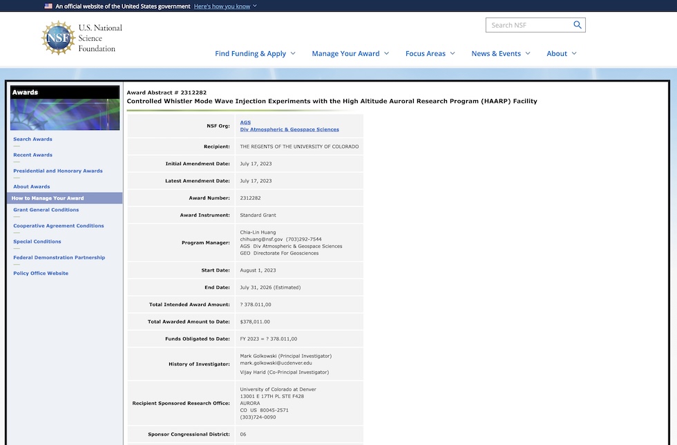 Am 17. Juli letzten Jahres vergab die National Science Foundation 378.000 Dollar an die University of Colorado in Denver für „kontrollierte Whistler-Welleninjektionsexperimente mit der HAARP-Anlage (High Altitude Auroral Research Program)“.