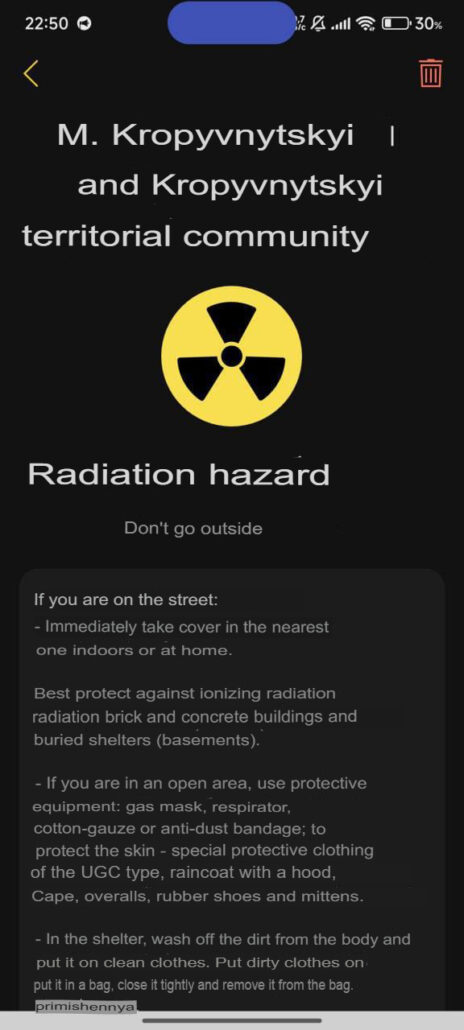 In der Ukraine werden Strahlenwarnungen ausgegeben. Die Menschen in Kropywnyzkyj werden aufgefordert, „Schutz zu suchen“. Ziegel- und/oder Betongebäude sowie Keller bieten den besten Schutz vor „ionisierender Strahlung“!