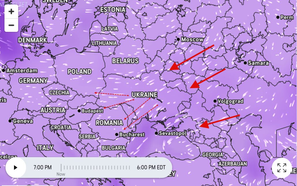 Diese Stadt liegt im Herzen der Ukraine. Derzeit zeigen die vorherrschenden Winde in diesem Gebiet eine Bewegung von NORDOST NACH WEST (Richtung Polen) und SÜDWEST (Richtung Rumänien):