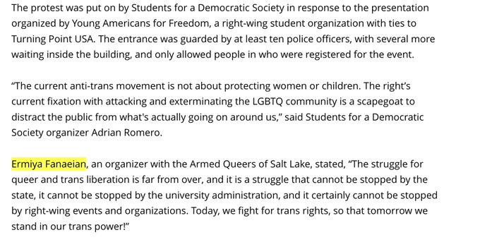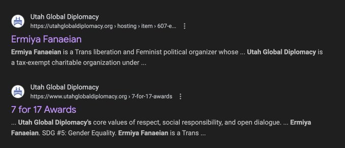 Ich möchte es betonen: SLC Armed Queers steht in keinem Zusammenhang mit der Auszeichnung, die Ermiya Fanaeian von Utah Global Diplomacy erhielt. Utah Global Diplomacy zeichnete sie speziell für ihre Arbeit mit Transsexuellen aus, für die SLC Armed Queers eine Schlüsselrolle spielt. Das könnte der Grund sein, warum sie ihre Seiten gelöscht haben.