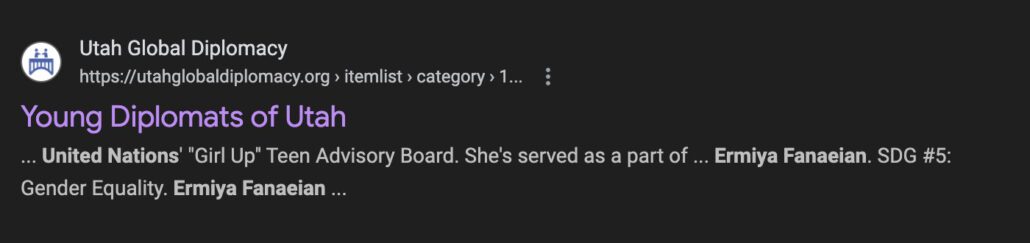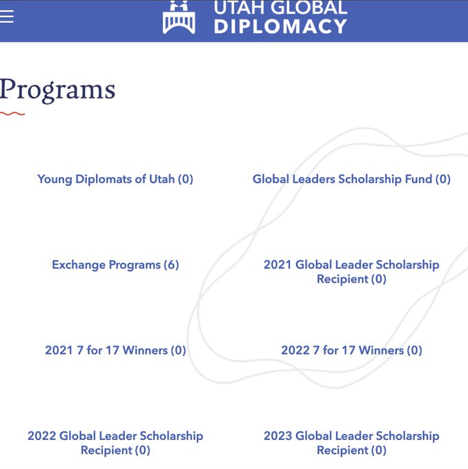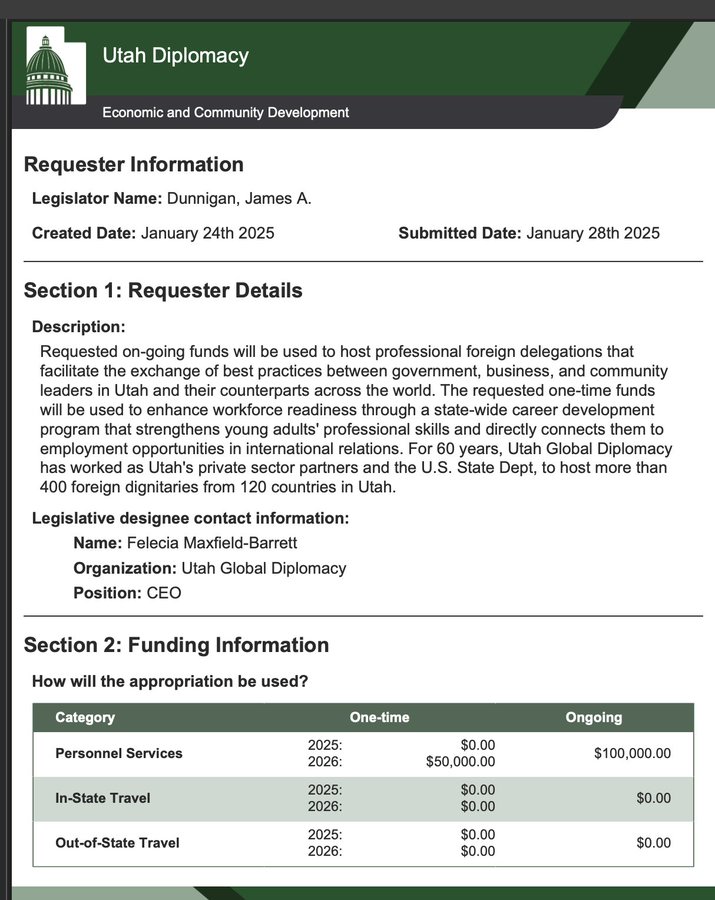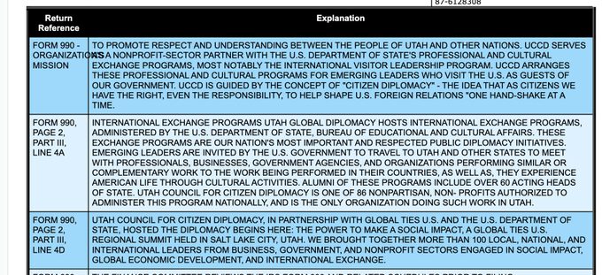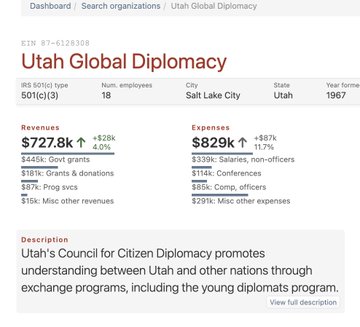 Laut Formular 990 von Utah Global Diplomacy (EIN 876128308) arbeitet die gemeinnützige Organisation mit dem US-Außenministerium zusammen, um aufstrebende Führungskräfte und diplomatische Initiativen zu fördern. Mit anderen Worten: Sie wurde ausgewählt, um „die US-Außenbeziehungen mitzugestalten“. Ihre Worte, nicht meine.
