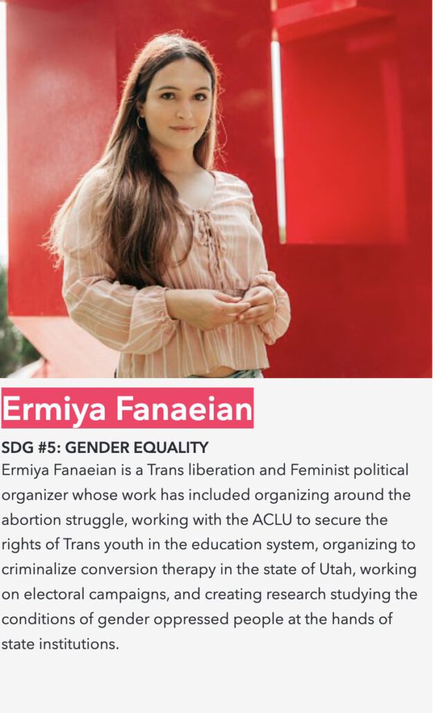 Fanaeian wurde als erste „7 für 17“-Preisträgerin von Utah Global Diplomacy für ihren Einsatz zur Förderung der 17 Nachhaltigkeitsziele der UN ausgezeichnet. Ich fasse die genaue Art ihrer Arbeit für die UN zusammen.