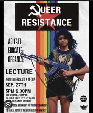 Armed Queers SLC gibt an, seine Mission sei es, schwule, queere und transsexuelle Menschen darin zu schulen, sich zu bewaffnen und gegen den Kapitalismus zu kämpfen. Obwohl ihre angebliche Facebook-Seite nicht direkt zum Einsatz von Schusswaffen im Rahmen ihrer angeblichen Mission zu ermutigen scheint, zeigen viele der verwendeten Bilder Schusswaffen. Erst im Frühjahr reisten die Mitglieder nach Kuba, um den 1. Mai zu feiern und gemeinsam mit Revolutionären aus aller Welt an einem Marsch und Veranstaltungen teilzunehmen .