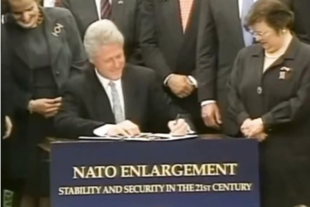 Die unwiderlegbaren Fakten, die oben berichtet wurden, können nicht bestritten oder wegerklärt werden. Das Dokument des US-amerikanischen National Security Archive BEWEIST, dass die USA versprochen haben, „die NATO wird keinen Zentimeter nach Osten vorrücken“, und später war es Präsident Bill Clinton, der dieses Versprechen brach und seine Zustimmung dazu unterzeichnete, dass die NATO genau das tun würde. Sie brauchen Beweise? Hier ist das Foto von Bill Clinton, der es tut: