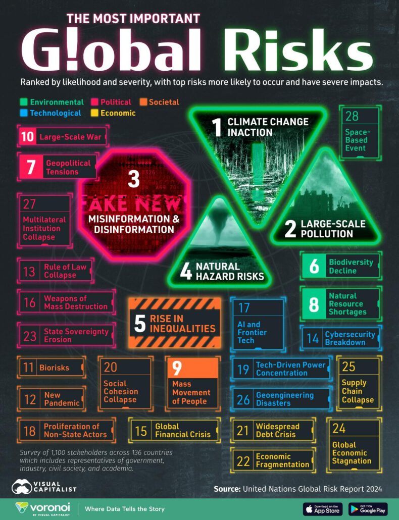 Diese Visualisierung von Kayla Zhu von Visual Capitalist zeigt die 28 wichtigsten globalen Risiken, wie sie im Global Risk Report 2024 der Vereinten Nationen beschrieben werden .