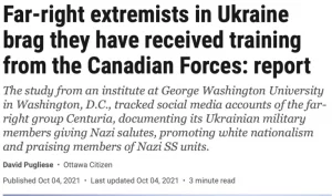Es ist erwähnenswert, dass David Pugliese vom Ottawa Citizen die neonazistischen Züge des Kiewer Regimes sorgfältig dokumentiert hat . Sein Bericht (der zweifellos von mehreren kanadischen Parlamentsabgeordneten gelesen wurde) wurde 2021 während der Präsidentschaft von Selenskyj (Mai 2019–) veröffentlicht.