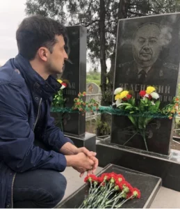 In einer bitteren Ironie legte er wenige Tage vor seinem Amtsantritt [Mai 2019] „Blumen auf das Grab seines Großvaters Semjon Iwanowitsch Selenski (Bild rechts), der im Zweiten Weltkrieg in der Roten Armee der Sowjetunion gekämpft hatte“.