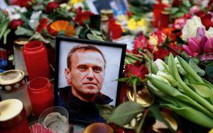 ©HANNIBAL HANSCHKE/EPA/MAXPPP – epa11170433 A photo showing late Russian opposition leader Alexei Navalny sits among floral tributes outside the Russian embassy in Berlin, Germany, 21 February 2024. Outspoken Kremlin critic Alexei Navalny died in a penal colony, the Federal Penitentiary Service of the Yamalo-Nenets Autonomous District announced on 16 February 2024. In late 2023 Navalny was transferred to an Arctic penal colony, considered one of the harshest prisons. EPA-EFE/HANNIBAL HANSCHKE (MaxPPP TagID: maxnewsfrfive494871.jpg) [Photo via MaxPPP]