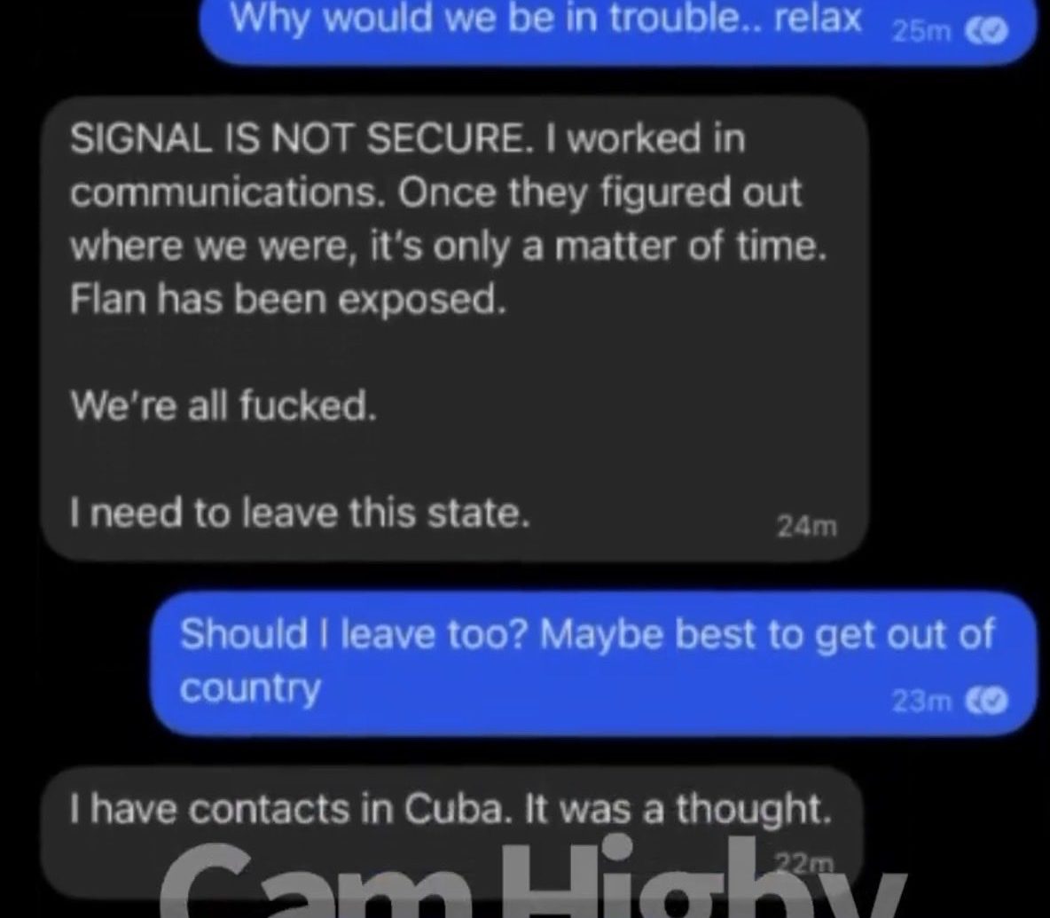 • Chatprotokolle, die Panik unter Aktivisten zeigen, wie der berüchtigte Screenshot, auf dem Nutzer ausflippen: „SIGNAL IST NICHT SICHER… Flan wurde enttarnt. Wir sind alle am Arsch. Ich muss diesen Staat verlassen.“ Und Antworten wie: „Soll ich auch gehen? Vielleicht ist es am besten, das Land zu verlassen… Ich habe Kontakte in Kuba.“ (Mit Cams eigenem Wasserzeichen versehen – ikonisch).
