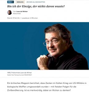 “Der Anlass für den Artikel war ein Gesetz, das vor einigen Wochen von Donald Trump unterzeichnet wurde. Dieses Gesetz erzwingt Untersuchungen zu „biologischen Waffenexperimenten mit und im Zusammenhang mit Zecken [und] durch Zecken übertragenen Krankheiten“. Bin ich der Einzige, der nichts davon wusste?