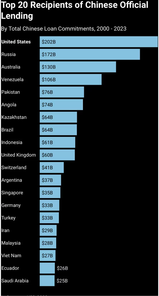 Ein Balkendiagramm zeigt die 20 größten Empfänger chinesischer Staatskredite von 2000 bis 2023. Die Vereinigten Staaten erhielten 202 Milliarden US-Dollar, gefolgt von Russland, Australien, Venezuela und anderen.