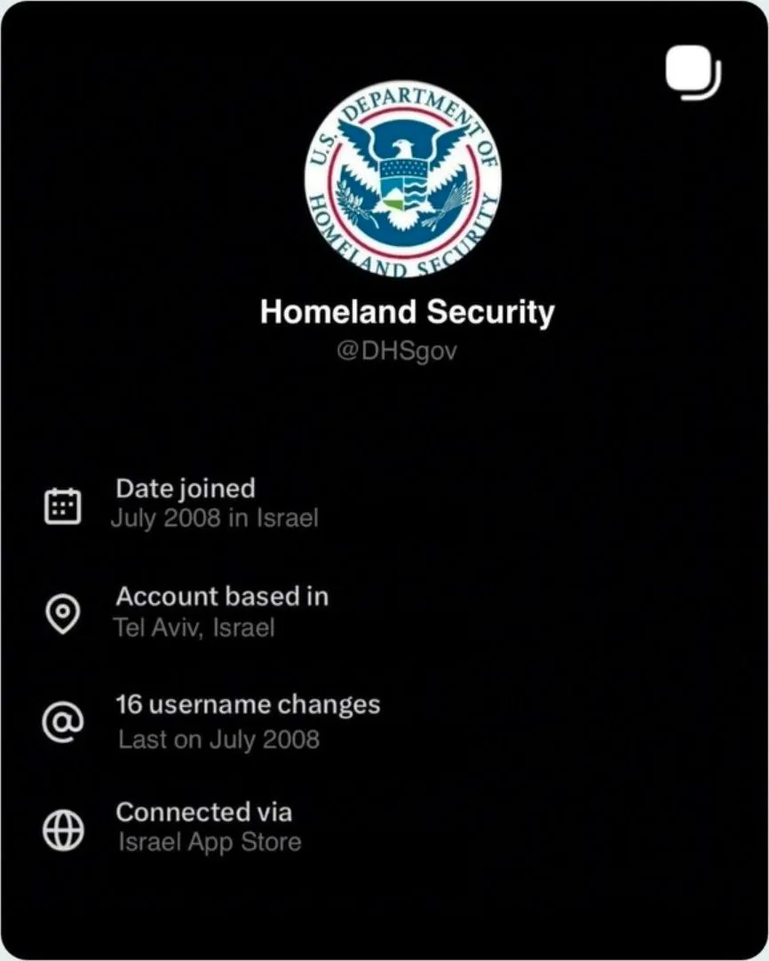 Ein Screenshot des Twitter-Profils des US-Heimatschutzministeriums, aus dem Datum und Ort der Registrierung als Tel Aviv, Israel, hervorgeht.