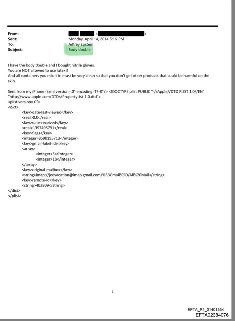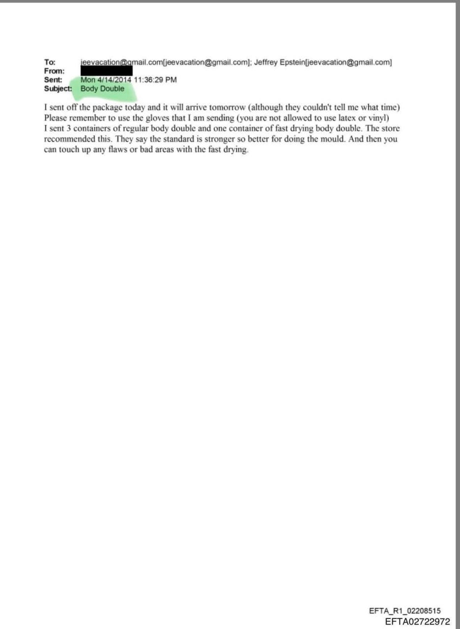 Es wird auch seltsam. Eine Suche in den Epstein-Akten nach „Körperdouble“ zeigt, dass Epstein angeblich „3 Behälter mit Körperdouble und ein schnell trocknendes Körperdouble“ anfertigen ließ, wofür eine Form verwendet wurde.
